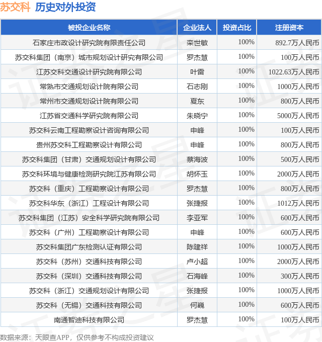 本站消息,根据天眼查APP显示,苏交科(300284.SZ)新增一起对外投资事件,被投资公司为北京骏电新能源科技有限公司金勺子,法定代表人杨朔,投资占比为-。该公司从事科技推广和应用服务业,注册资本为1054.5455万人民币。目前,苏交科共存在对外投资107项金勺子,投资占比前20的项目见下表: