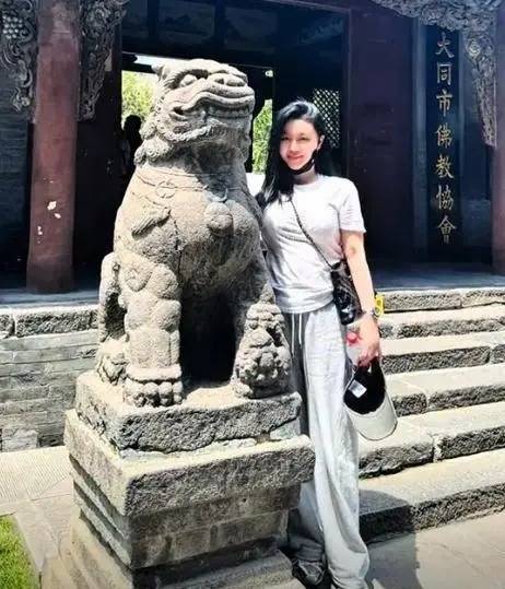照片中的她把帽子摘了下来拿在手上,身体靠在了一个石狮子的旁边,而这张是能看清楚她的脸。