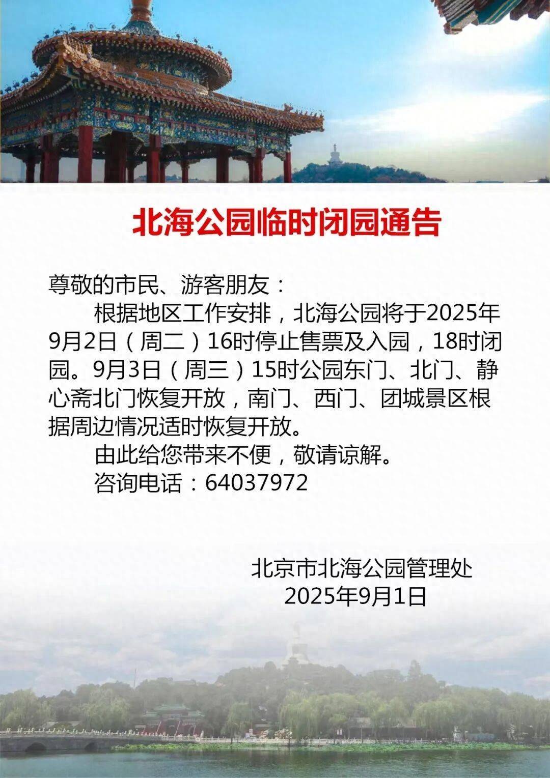 近日,北京多家公园发布公告称,因举办重大活动,9月3日前后临时闭园。