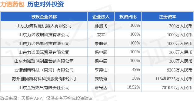 本站消息,根据天眼查APP显示,力诺药包(301188.SZ)新增一起对外投资事件,被投资公司为苏州创扬新材料科技股份有限公司,法定代表人龚晓青,投资占比为30%。该公司从事橡胶和塑料制品业,注册资本为11348.8235万人民币。目前益通网益通网,力诺药包共存在对外投资8项,详见下表: